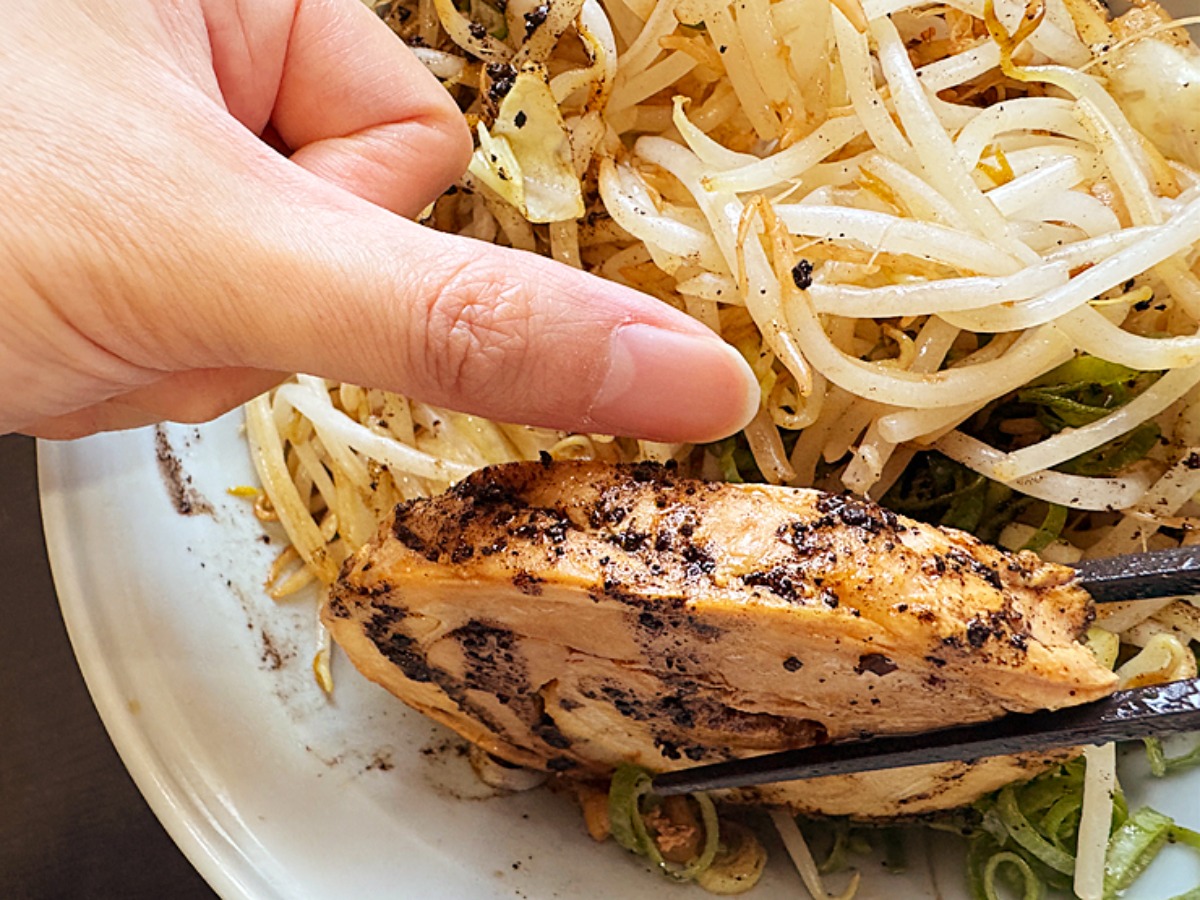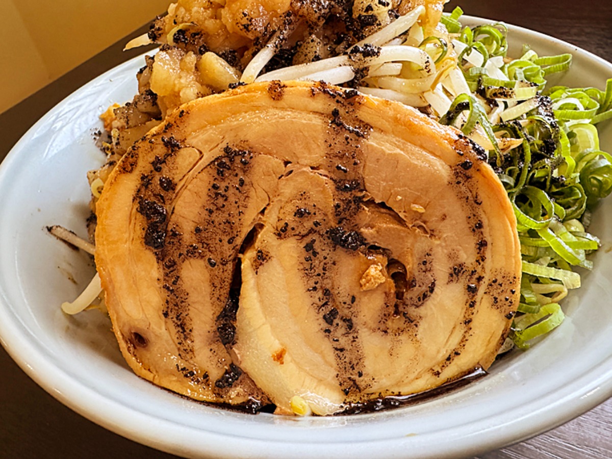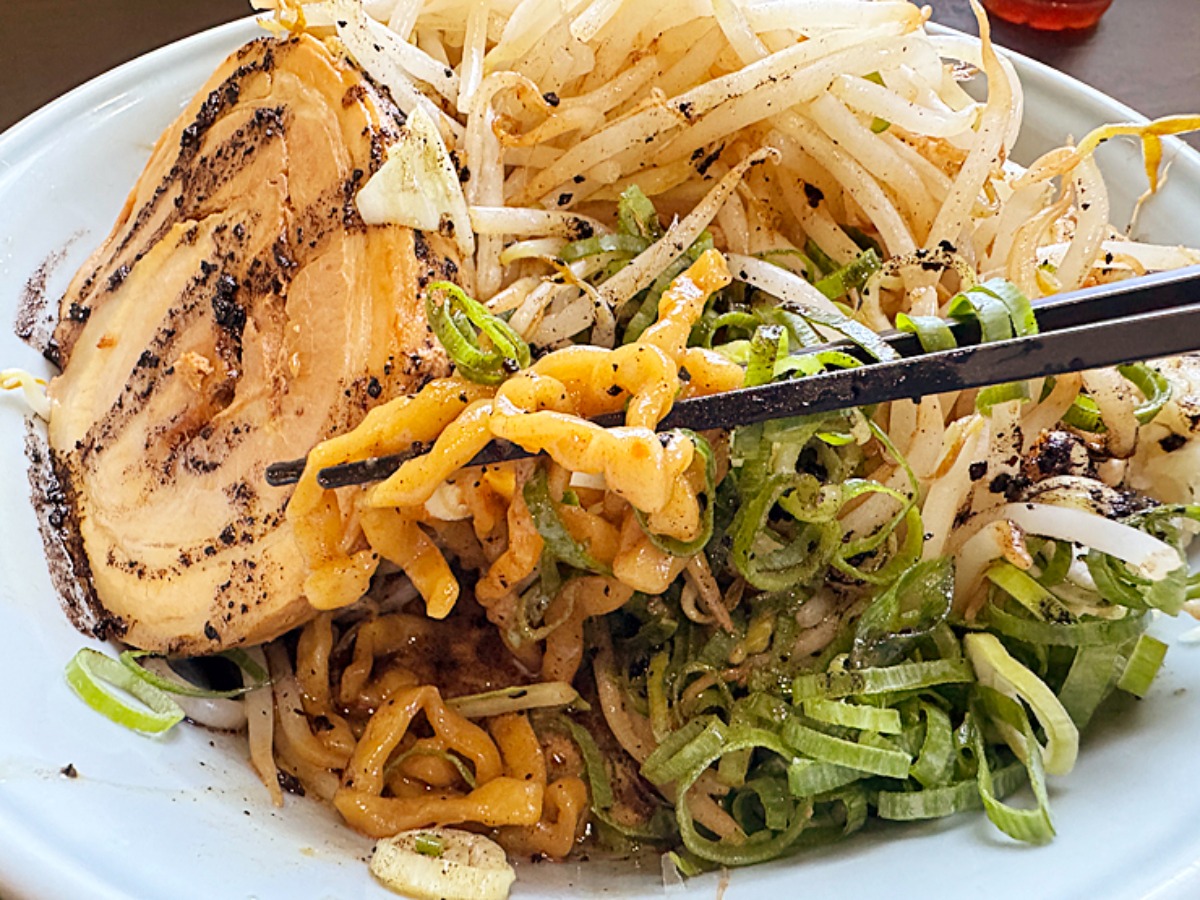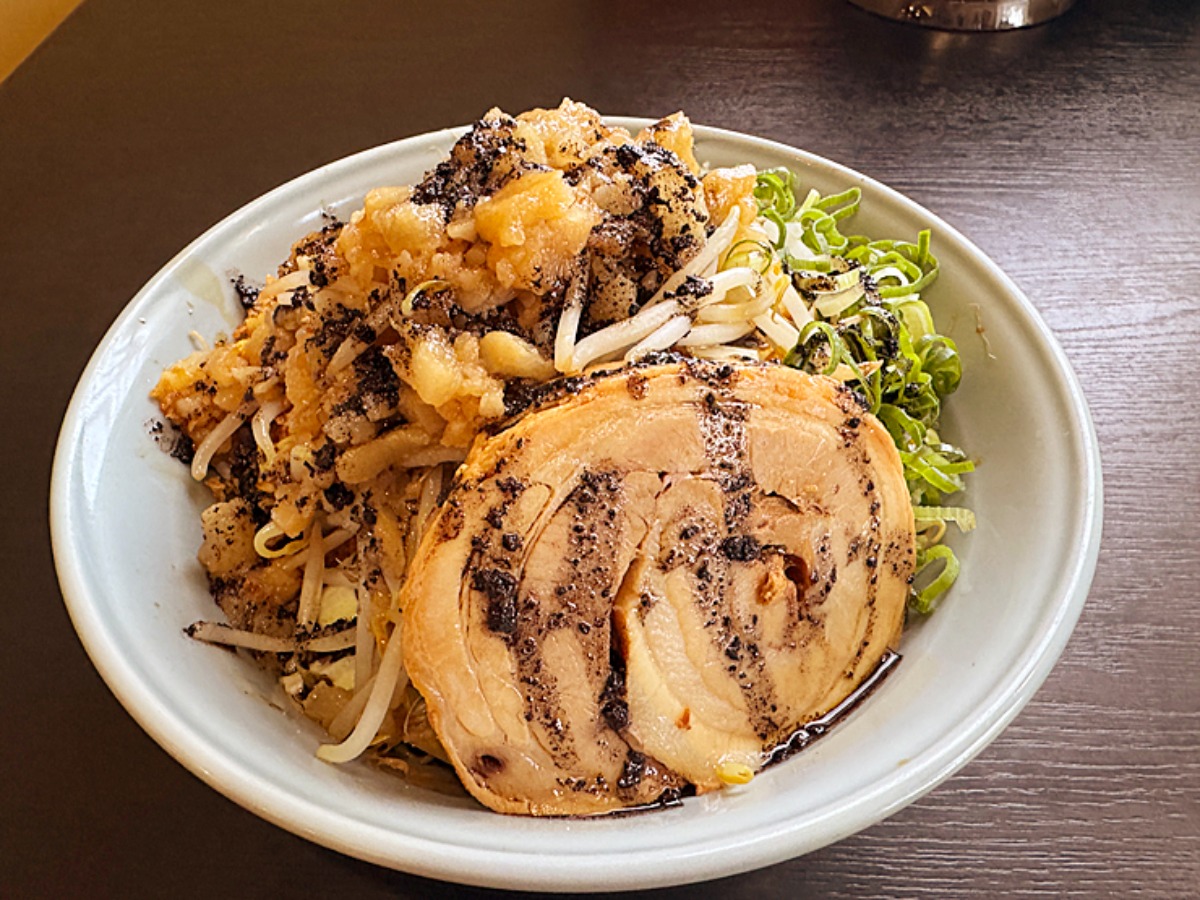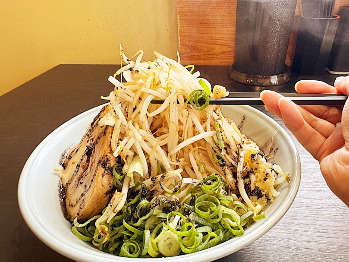 野菜マシにしたため山盛り状態で、最初は麺が見えないほど。上からかかる黒いタレは焦がしニンニクで、香ばしさとパンチのある風味が食欲を刺激します。