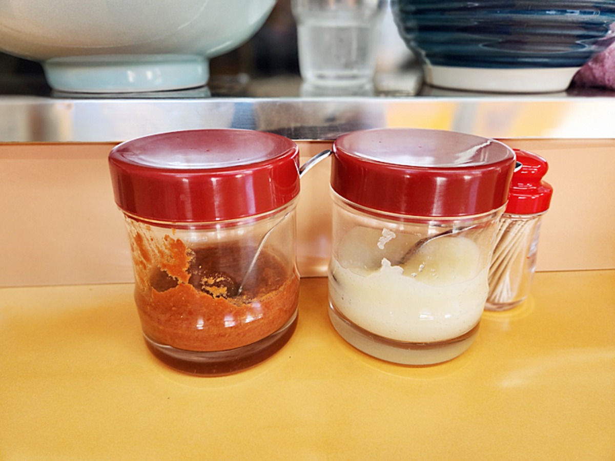 テーブルにおかれた豆板醬やニンニクで味変も可能。