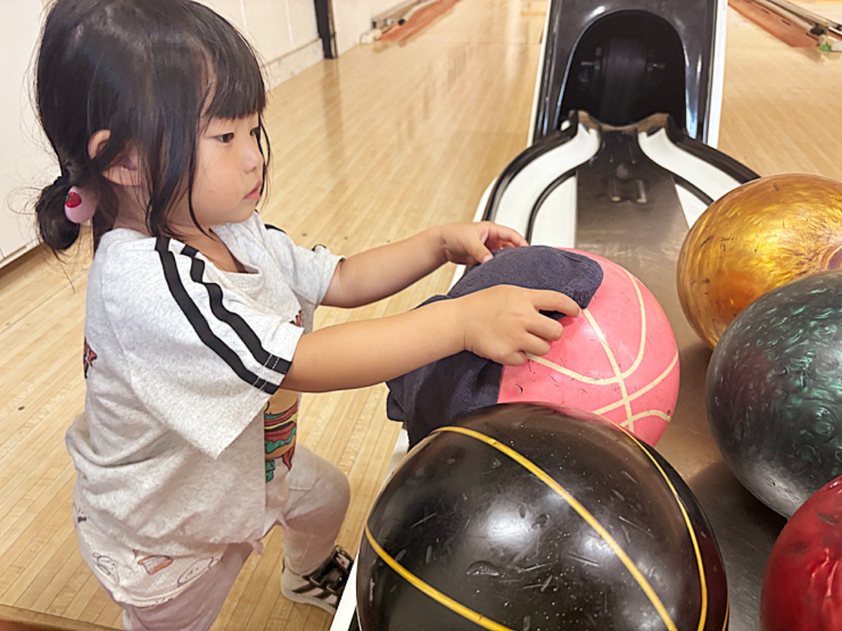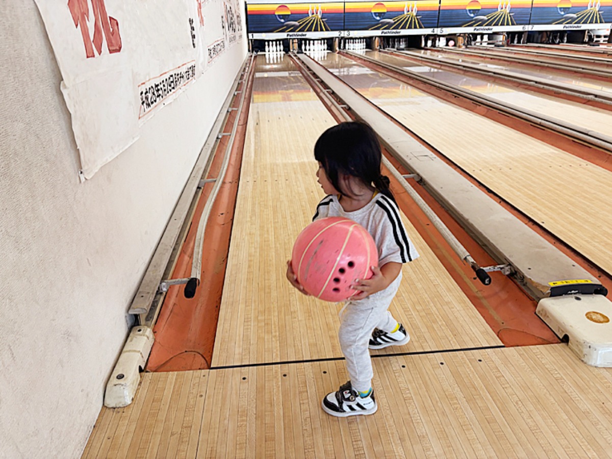 1番軽いボウルでも5ポンド(約2.3キロ)あるので、子どもが投げるときはドキドキですが、そんな親の心配をよそに3歳の次女さん…