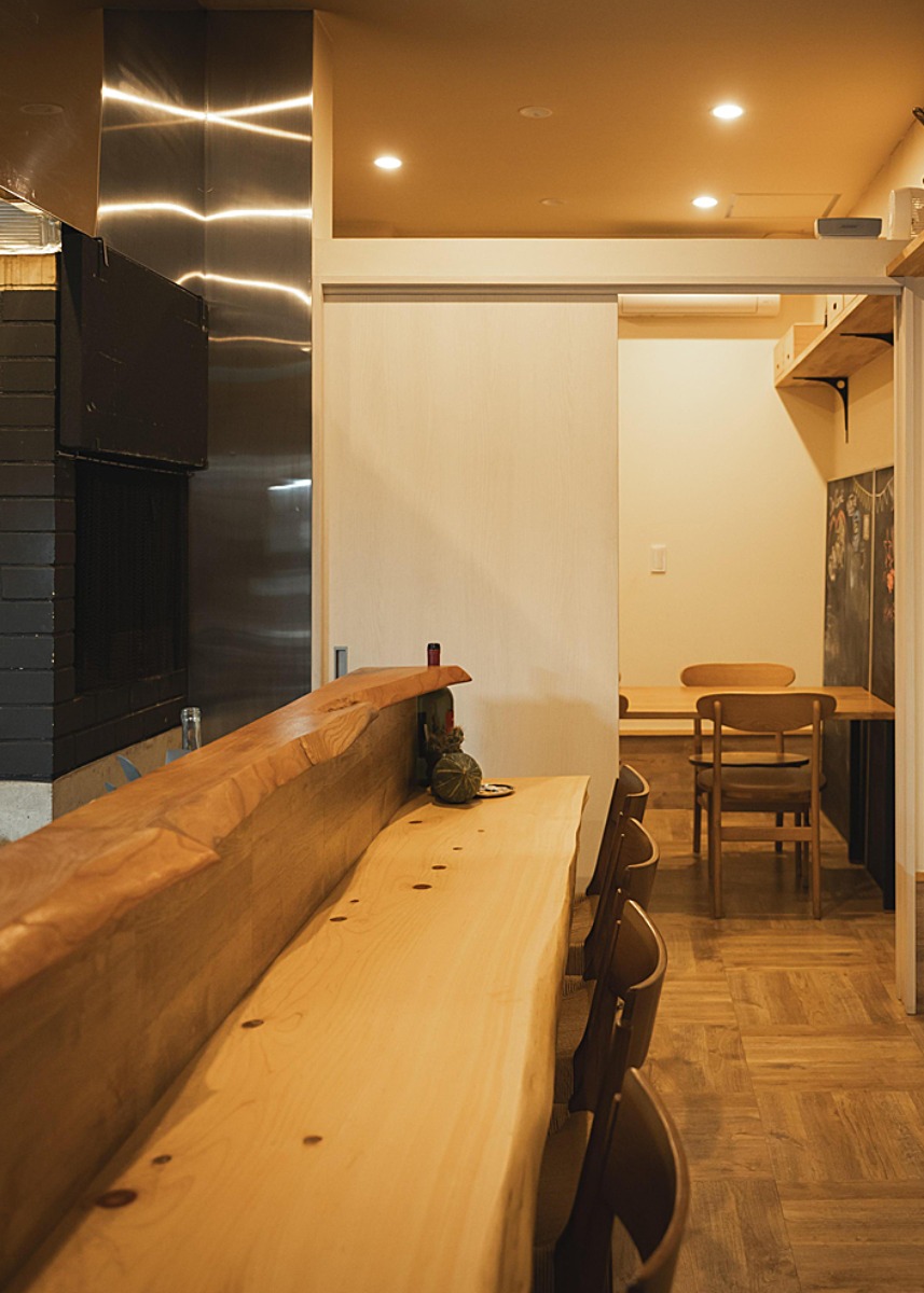 柔らかい照明で落ち着いた雰囲気の店内。薪火で焼くステーキの香ばしい香りが漂う