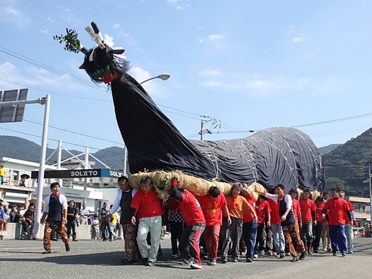 全長約10メートルの青い頭部を持つ牛鬼と、2人で叩く約10×4メートルの四ツ太鼓が、それぞれ東西に分かれて対決します。