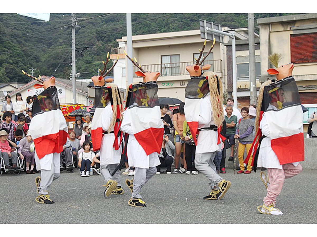 「牛鬼と四ツ太鼓の練り」の前日には「五ツ鹿踊」や「唐獅子舞」など、地元の人々が家々を巡り舞い踊る幻想的な風景が広がります。