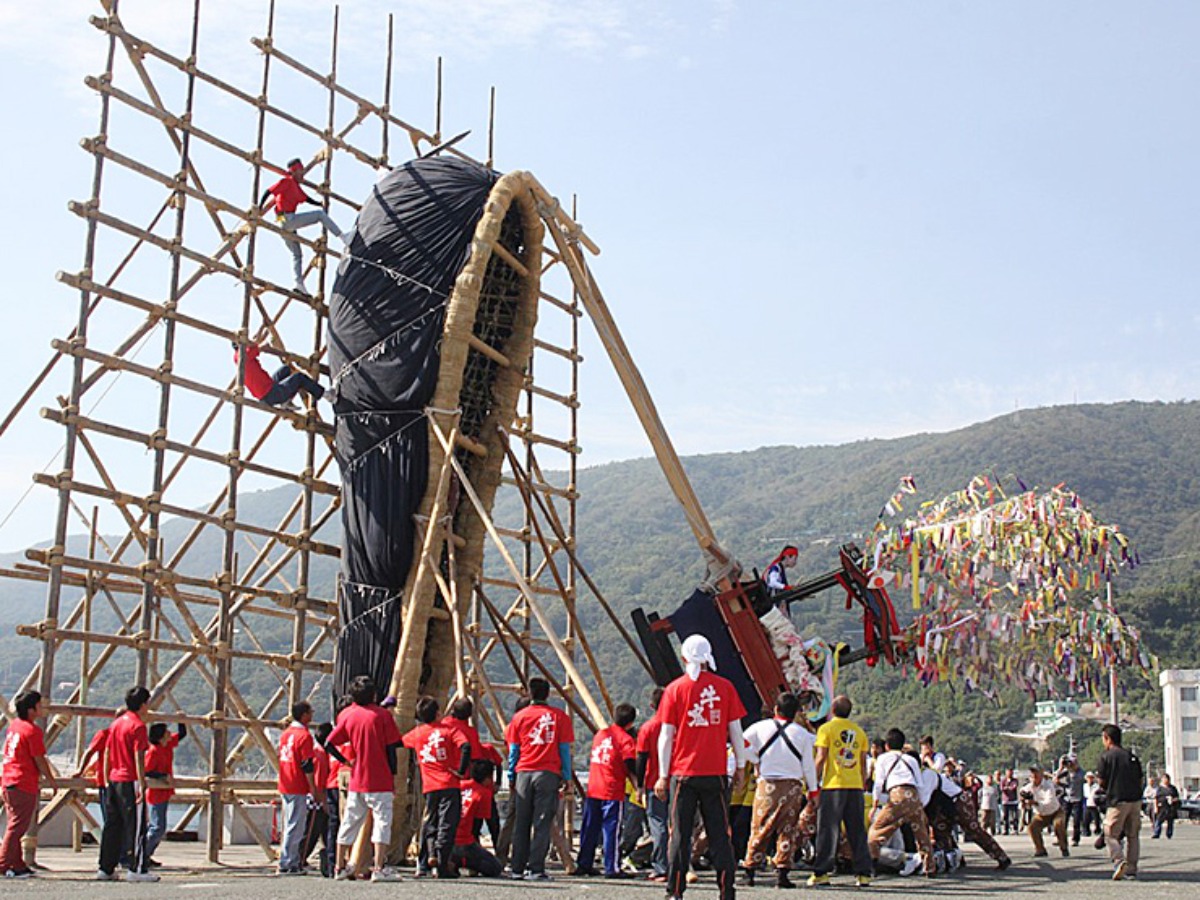 丸太を組んだ足場で牛鬼の胴体を縦に立て、四ツ太鼓も高く掲げて、互いにもたれ合いながら一斉に倒し、どちらが上に重なるかで勝敗が決まるのだそうですよ♪