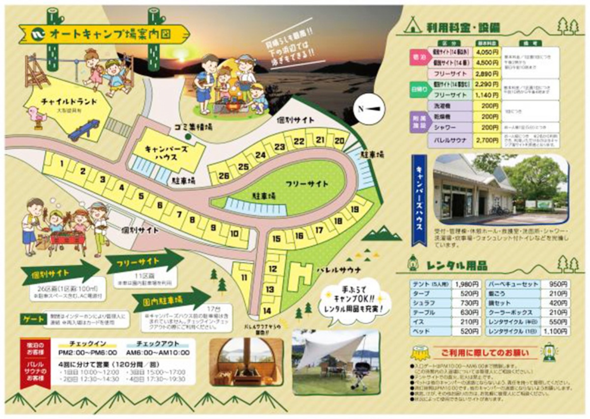 Wi-Fi対応や食品・薪の販売、豊富なレンタル品など、初めてのキャンプでも不安なく過ごせるサービスが揃っています。
