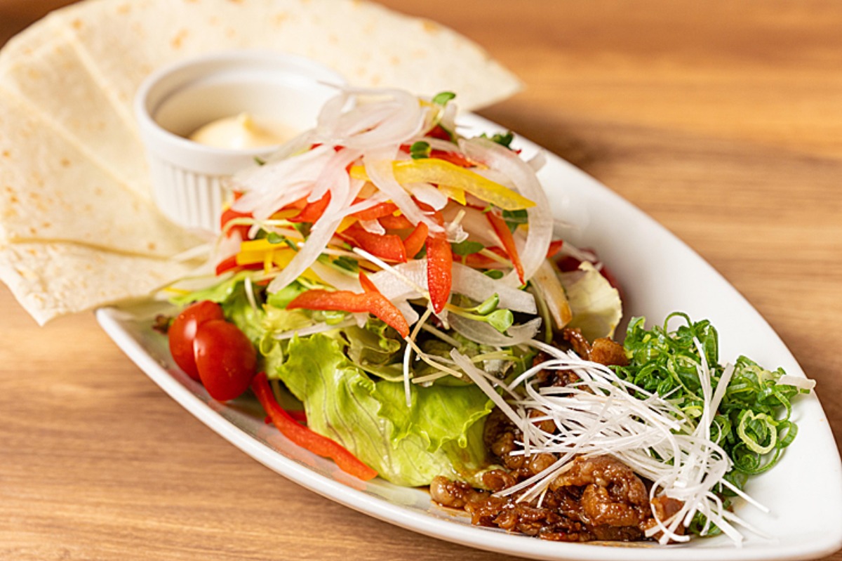 特製の甘辛ダレにじっくり漬け込んだ甘とろ豚を焼き上げ、青ネギ、白髪ネギ、シャキシャキ野菜とともにトルティーヤ生地で包んで味わうスタイル。