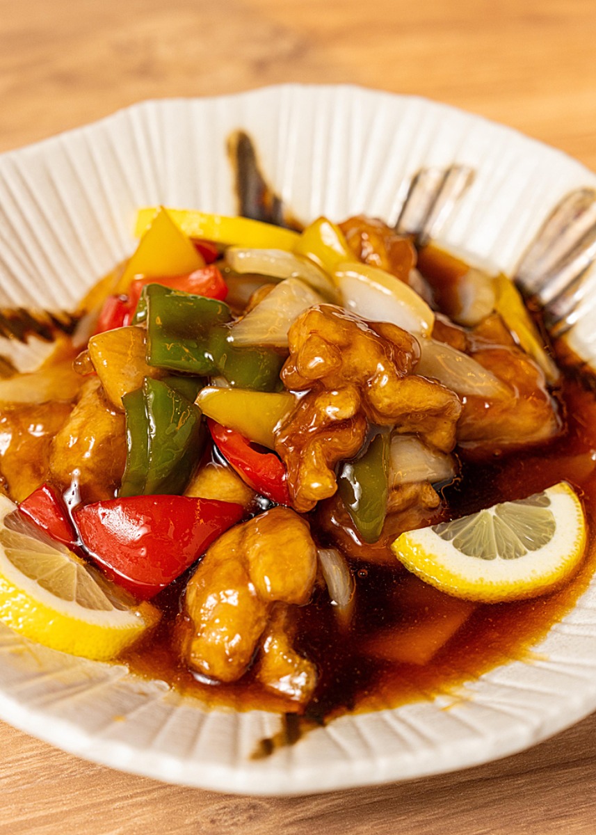 媛っこ地鶏を使用した「地鶏の甘酢」(800円)はサクサクの食感と甘酢あんの相性が抜群