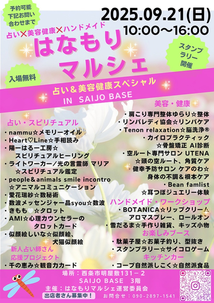 2025年9月、西条市で初開催となる「はなもりマルシェ 占い &美容健康スペシャル in SAIJO BASE」が開催されます。