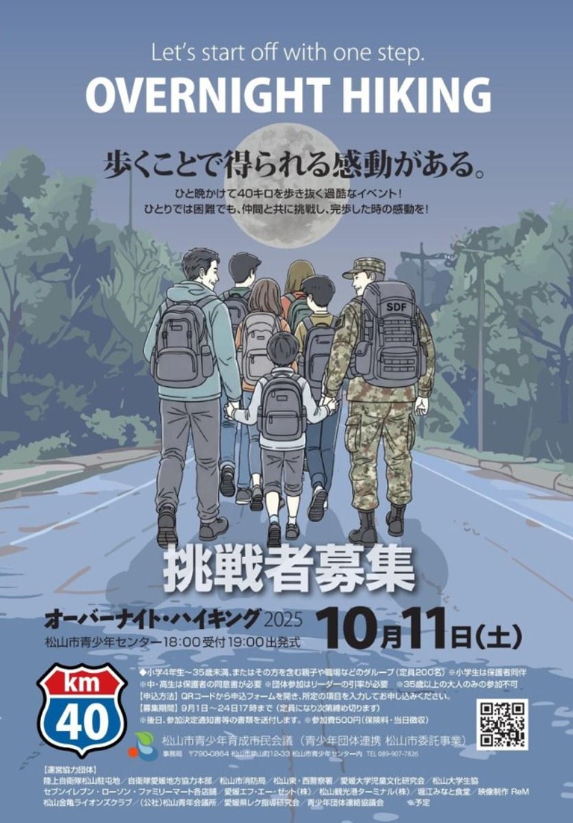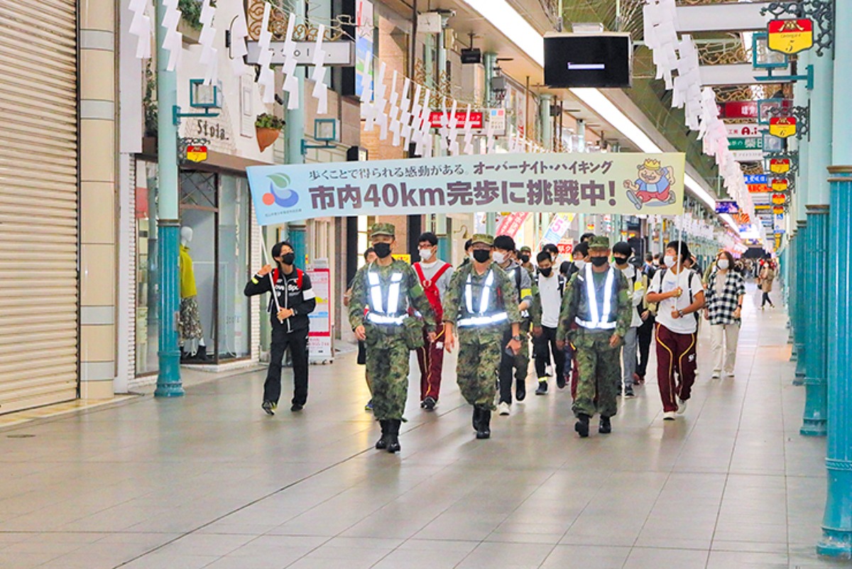 「松山市青少年センター」を夜20:00に出発し、大街道や空港通り、松山観光港、堀江港、夜明けの城山公園などを経由して、翌朝8:00に再び「松山市青少年センター」に戻る、全行程40kmのコースを歩きます。