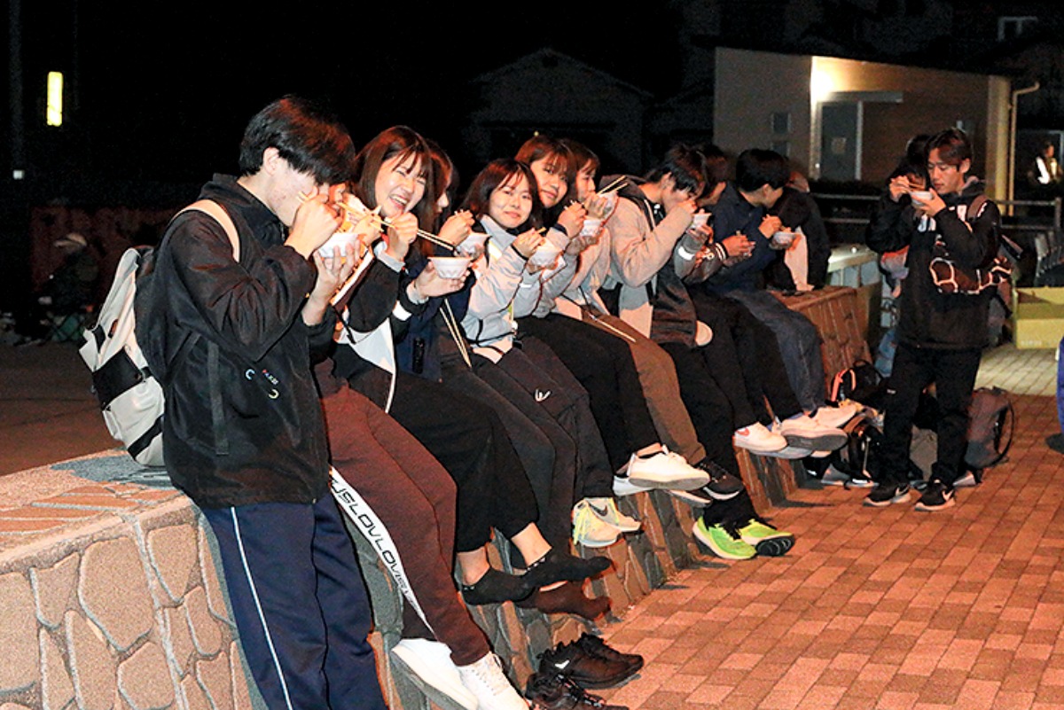 自分で用意した夜食を食べながらも、折り返し地点を過ぎた30km付近の休憩所では、温かい炊き出しが待っています。