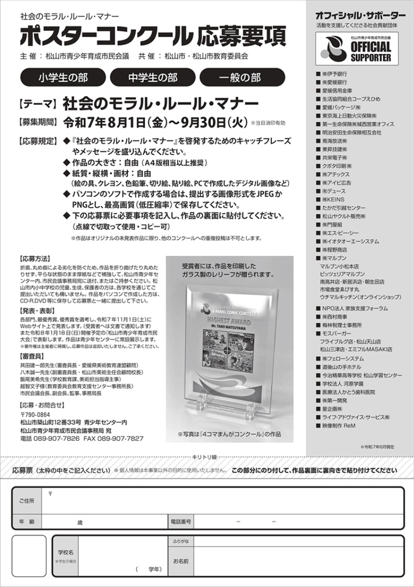 松山市青少年育成市民会議主催のポスターコンクールが今年も開催されます。