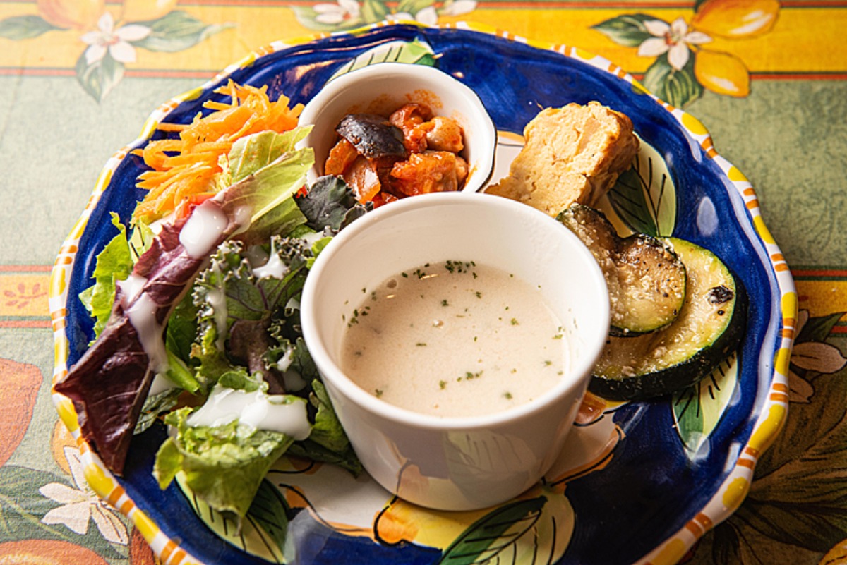 ランチはピッツァかパスタから選べ、季節感のある前菜(写真)がセットで付いてくる