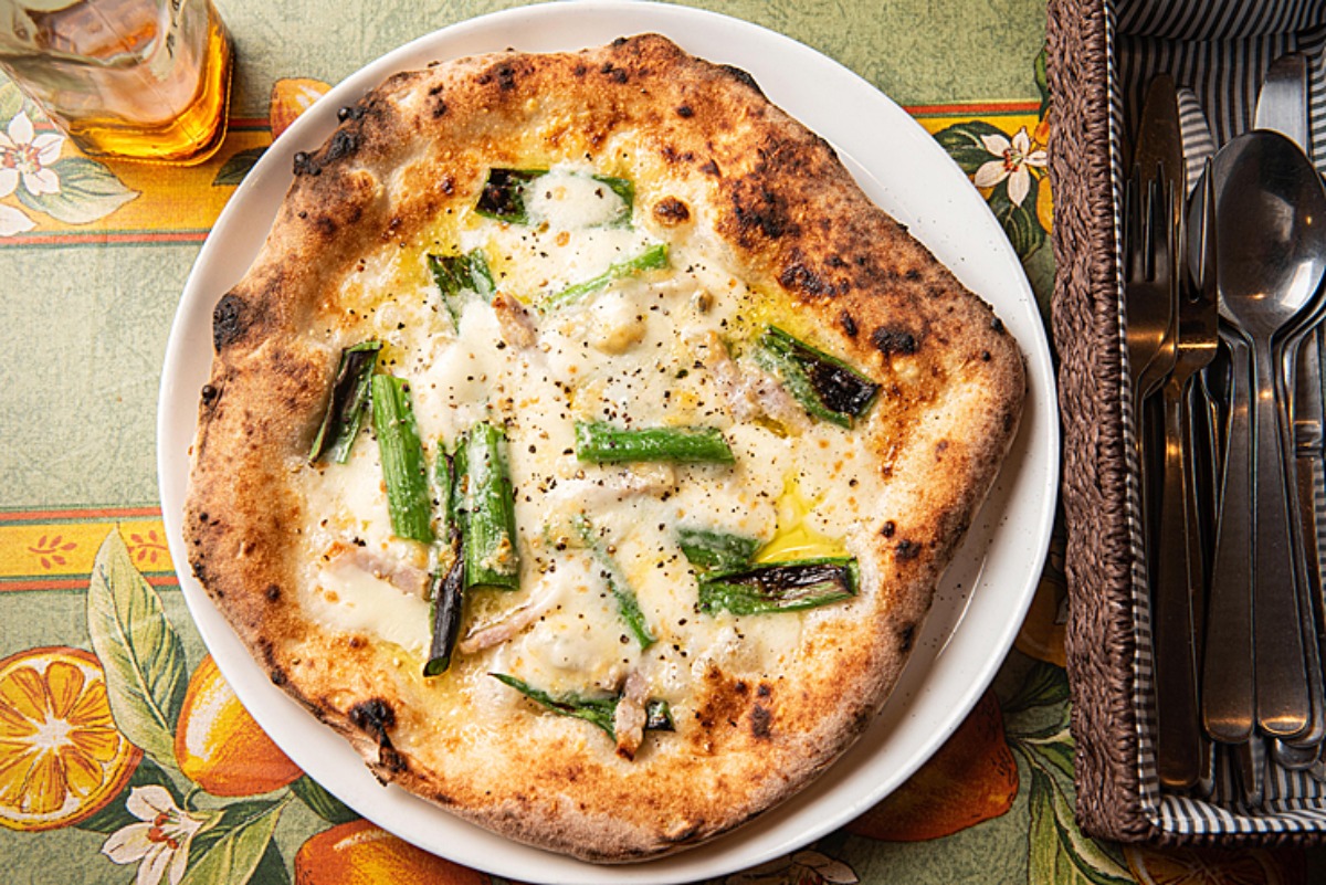 有機栽培の青ネギと甘とろ豚のパンチェッタをトッピングした「ネギトロフォルマッジ」。ゴルゴンゾーラチーズとの相性がよくクセになる