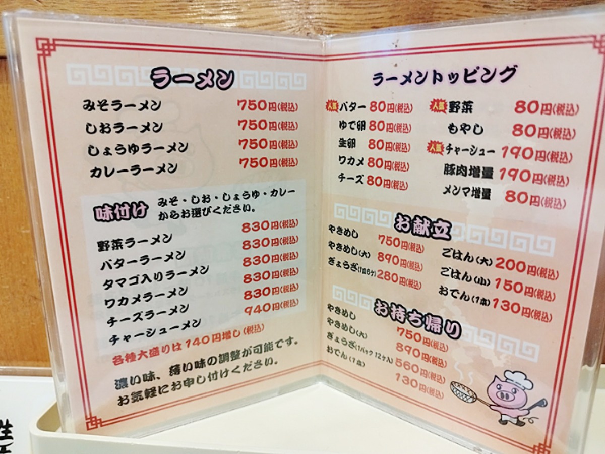 メニューは安心のみそ・しお・しょうゆラーメンに、トッピングも様々。