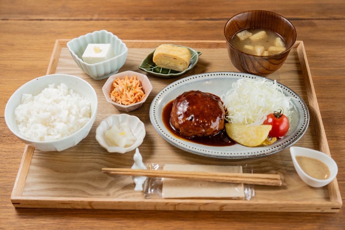 メインの「日替わりランチ」(1,000円)は、観光客はもちろん島民にも楽しんでもらえるよう、店主が毎日考案しています。メインのおかずに、副菜4種・ご飯・味噌汁が付いてきます。この日のメインは肉汁たっぷりの「デミグラスハンバーグ」でした。