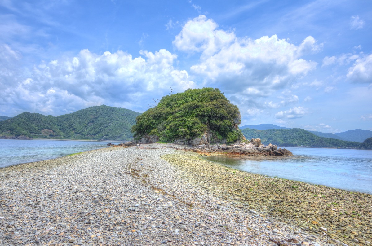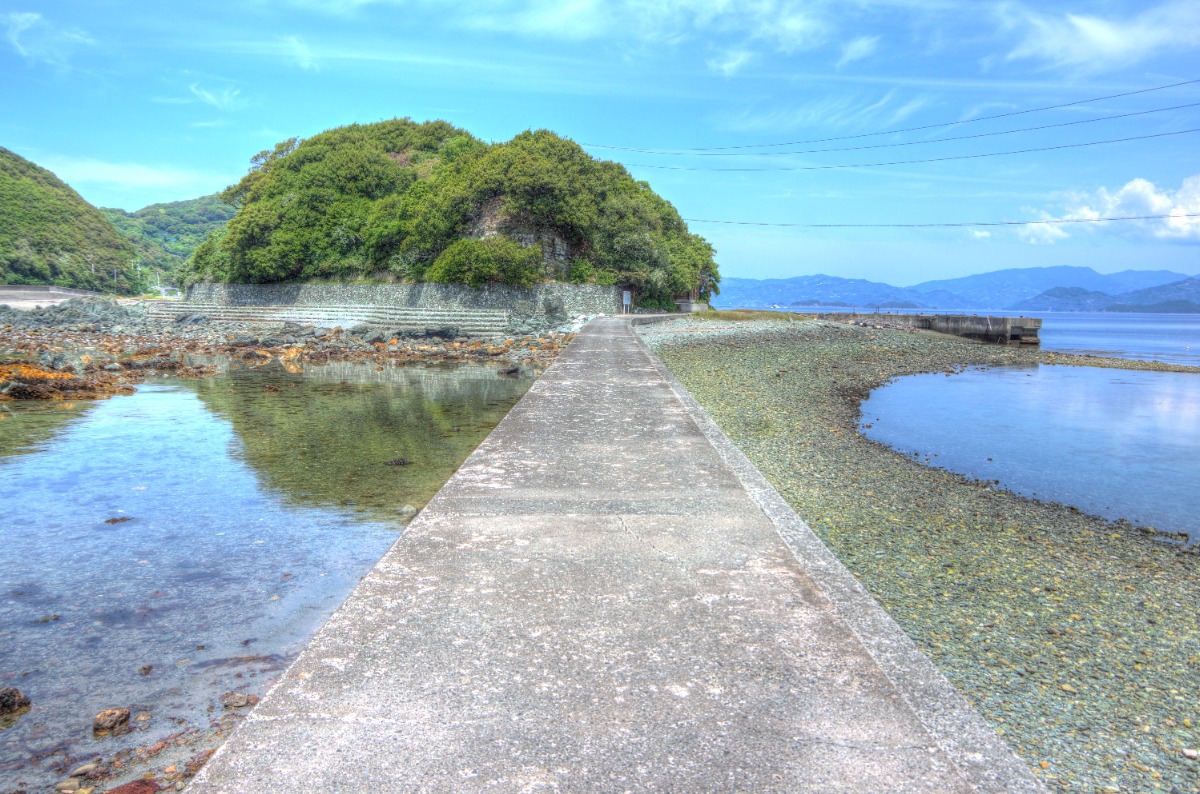 潮が引いた干潮時にだけ道が現れ、渡ることができる貝付小島。