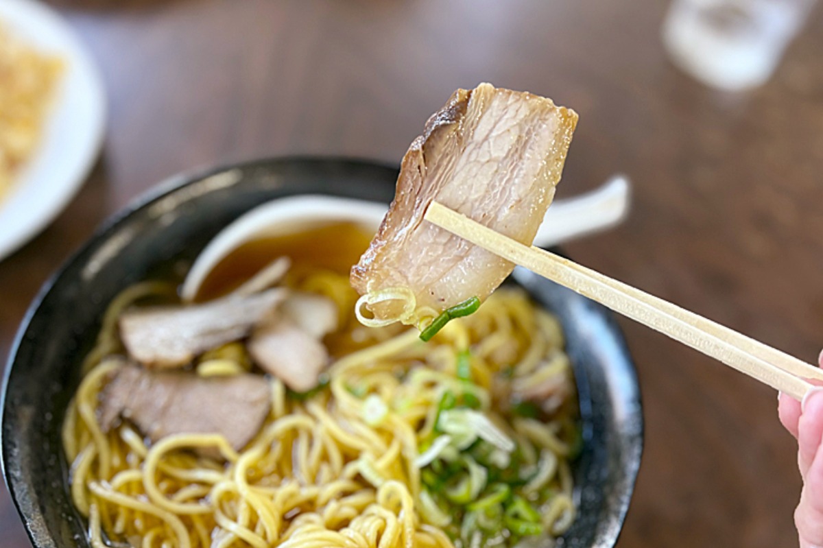 スープに浮かぶ背油とチャーシューが、見た目から美味しさを伝えます。