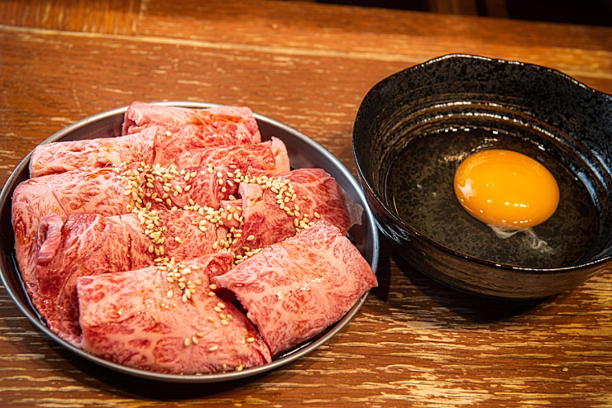 牛のミスジの焼きしゃぶ。甘みのある割り下につけて焼くことで、香ばしさUP。溶いた生卵に絡めてどうぞ