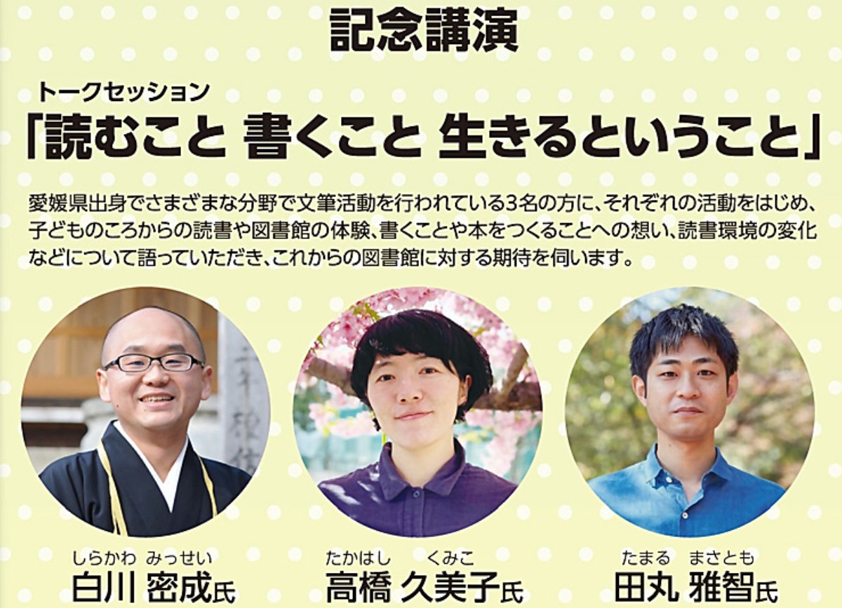 ウェブサイト「ほぼ日刊イトイ新聞」での連載をもとに『ボクは坊さん。』(ミシマ社)を出版した今治のお坊さんの白川密成さん、ロックバンド・チャットモンチーのドラム・作詞担当として活動し、現在は四国中央市と東京との2拠点で作家・農業活動をされている高橋久美子さん、松山出身のショートショート作家で、坊っちゃん文学賞の審査員も務められている田丸雅智さんの3名です。