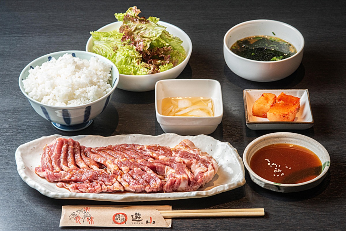 自家製の甘辛ダレに漬け込んだステーキカルビランチ。手のひらを超える大きさがあり、豚肉の概念を覆す美味しさ