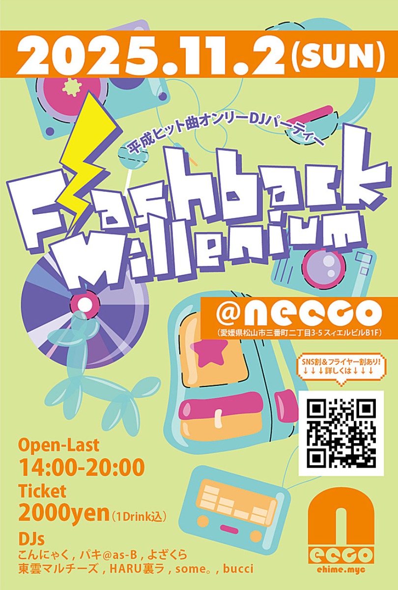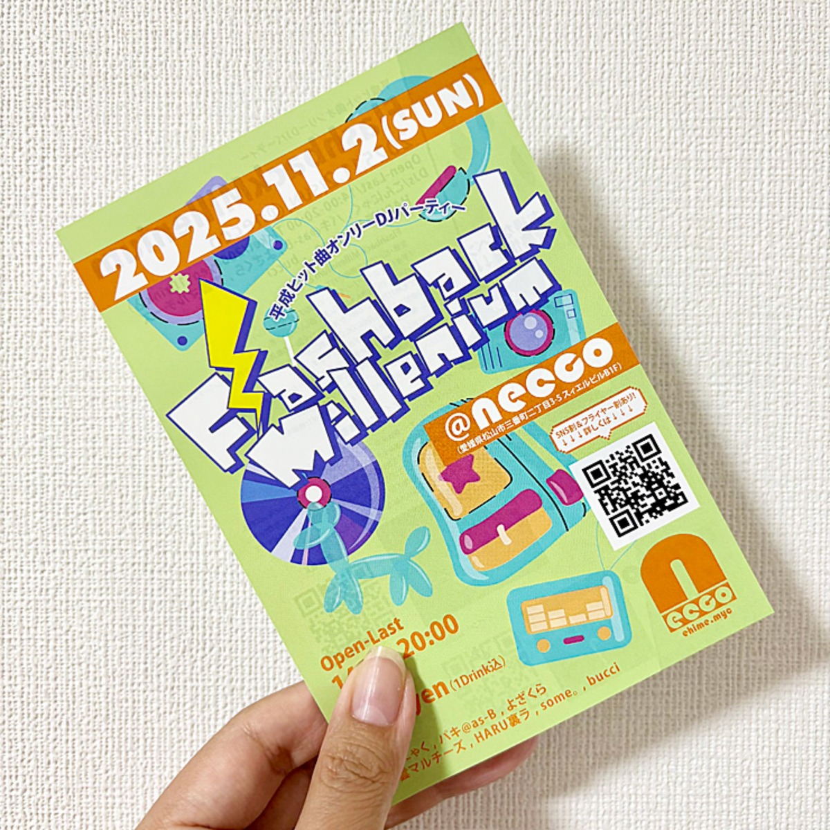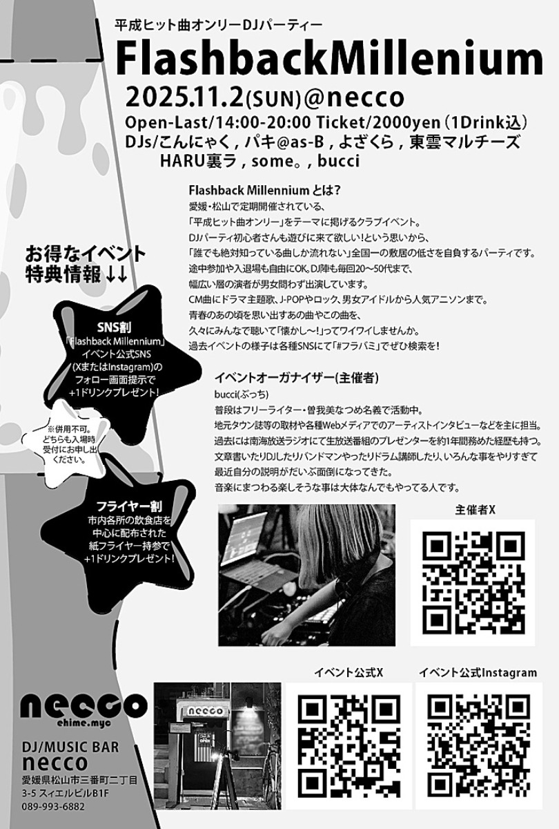 2025年11月2日(日)、松山市三番町にあるBar neccoにて、平成ヒット曲だけを集めた音楽イベント「Flashback Millennium vol.4」が開催されます。