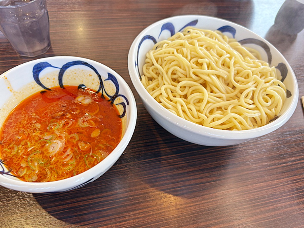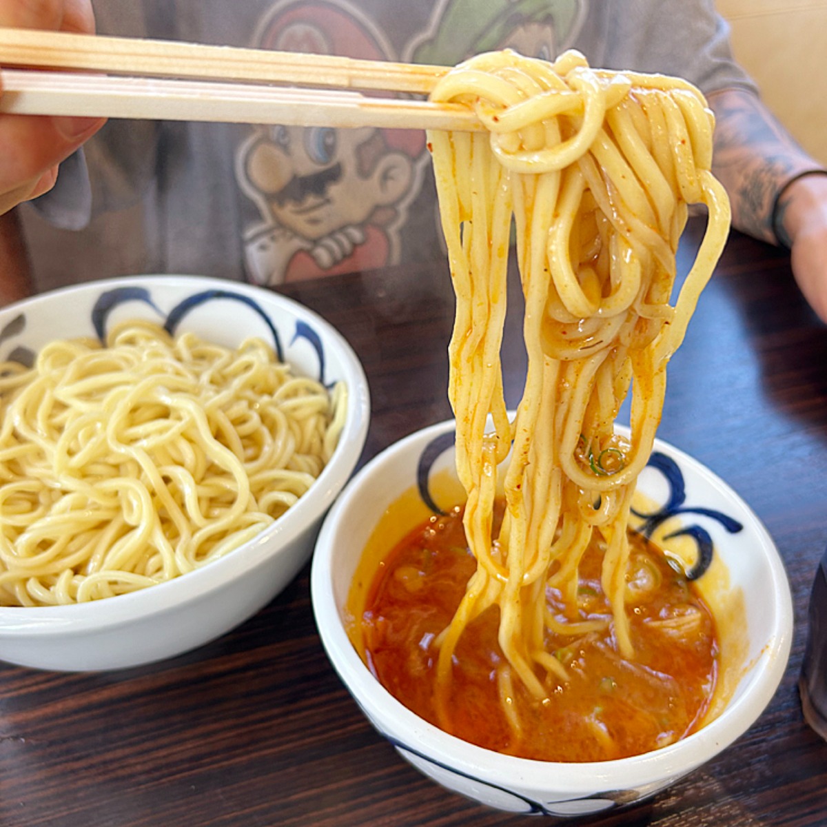 どっぷりとたっぷり、麺を真っ赤なつけ汁に思いきりダイブさせて豪快にいただきます。