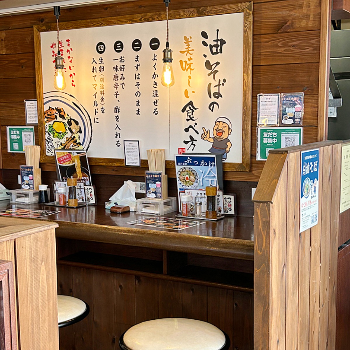 店内すぐに、カウンターがあり、油そばの美味しい食べ方が書いてあります。電球も内装の木の風合いとマッチしてオシャレ。