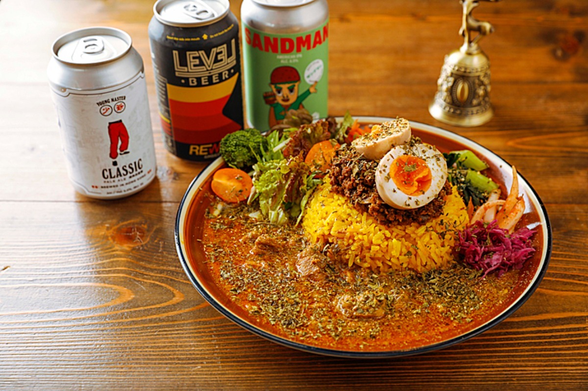 夜になると、棚に並ぶ酒瓶や照明がバーらしい雰囲気を演出し、国内外のクラフトビールやジンと一緒にカレーを味わえる大人の空間に変わります。