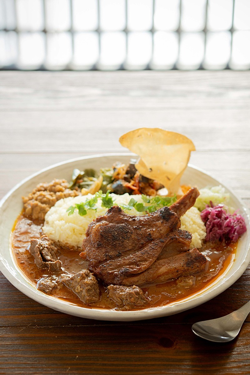 写真はラム肉のカレー(期間限定メニュー)。一度も冷凍していないラム肉は柔らかくジューシーな味わいです。