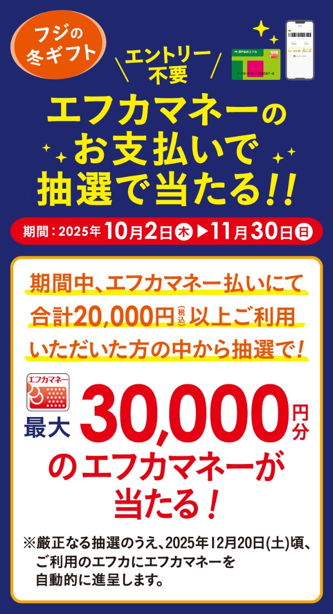 ※当選者の方には2025年12月20日(土)頃、ご利用のエフカにエフカマネーを自動的に進呈いたします。