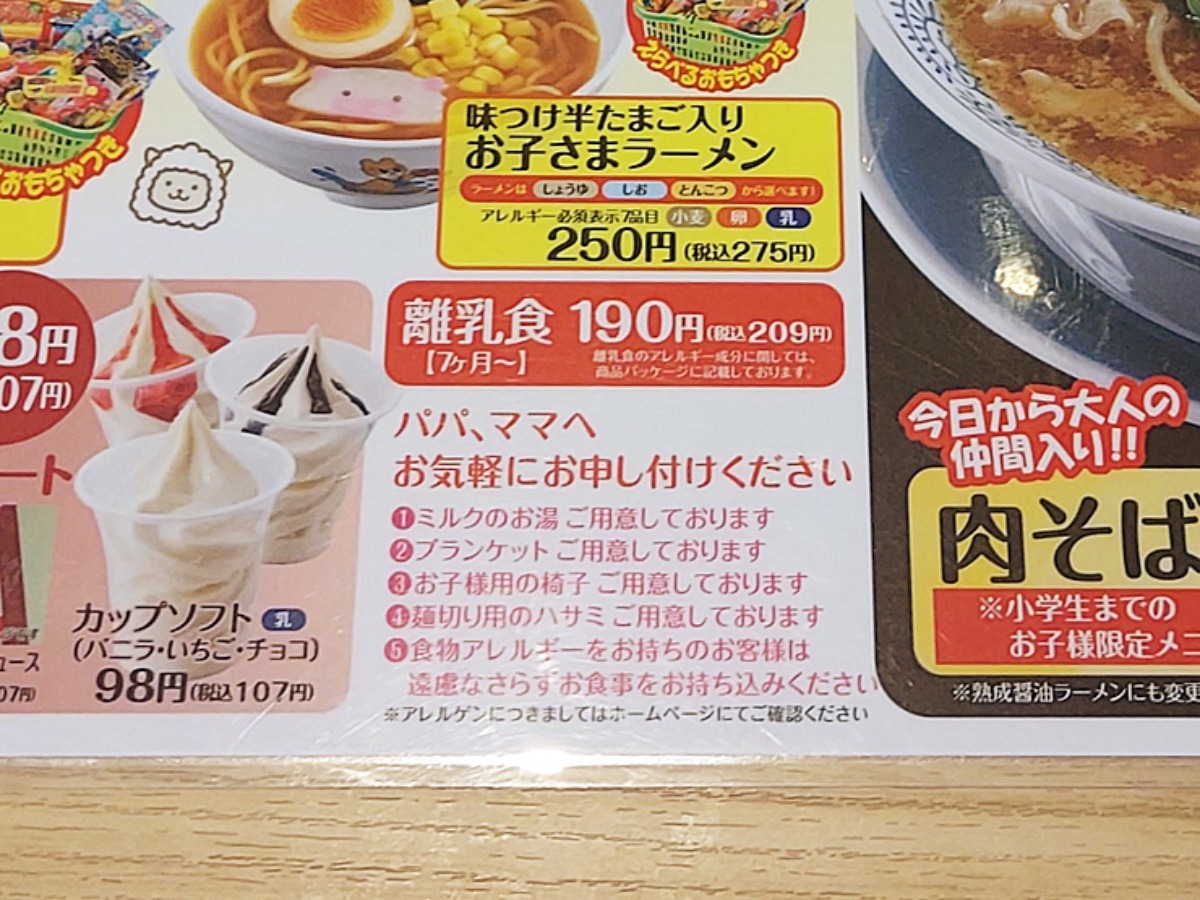 離乳食(190円 税抜)やミルク用のお湯の用意など、赤ちゃん連れのパパママにも優しいサービスが充実しています。