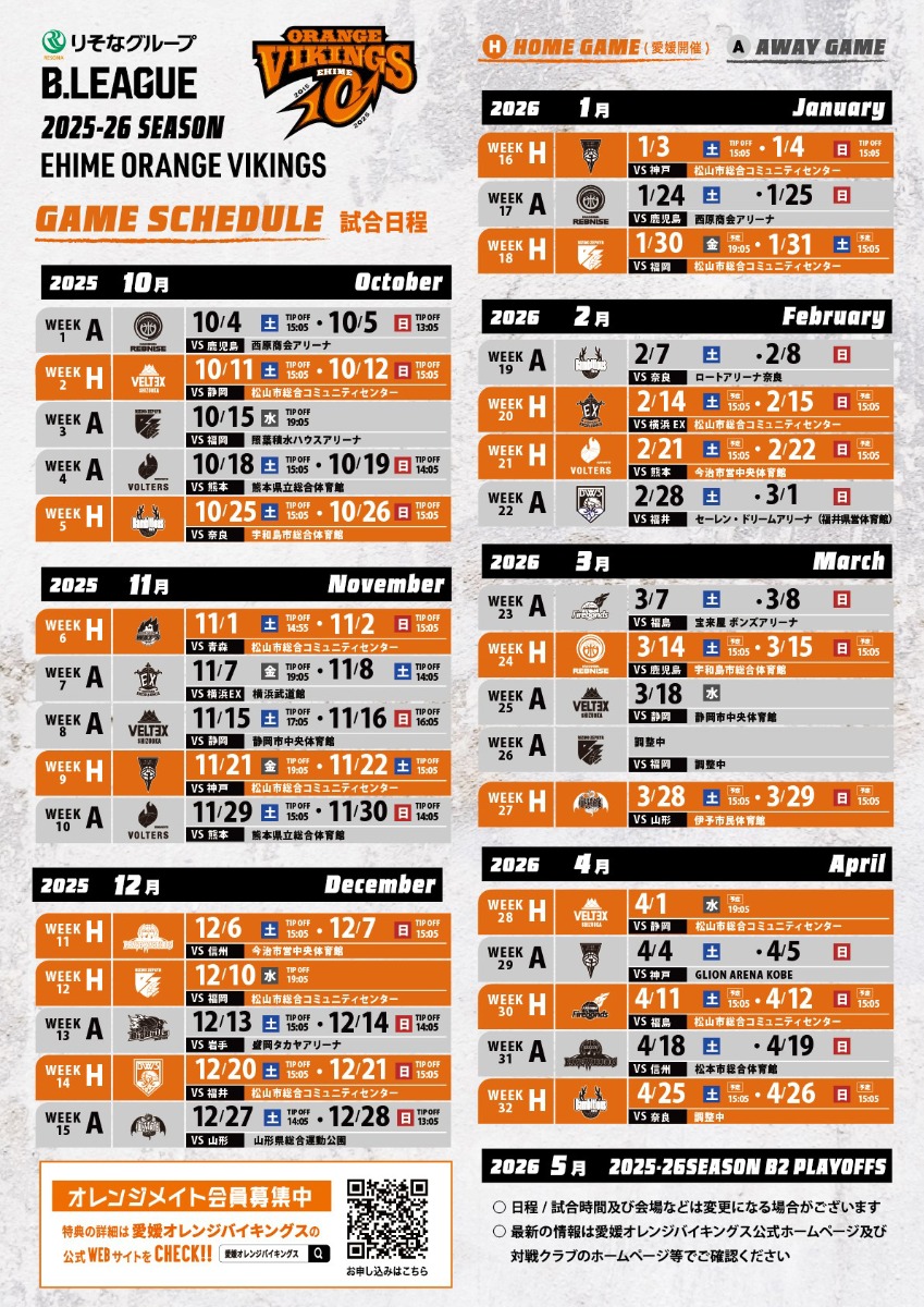 続く地元・愛媛でのホーム開幕戦は、その翌週となる10/11(土)、12(日)。