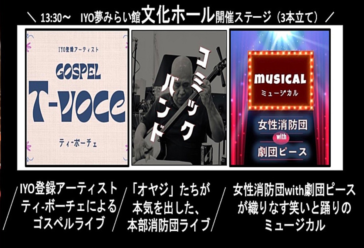 ゴスペルグループT-Voce(ティ-ボーチェ)による迫力のライブや本部消防団の熱量あふれるライブパフォーマンス、さらには女性消防団と劇団ピースによる笑顔と元気を届けるミュージカルと、バラエティ豊かなプログラムが用意されています。