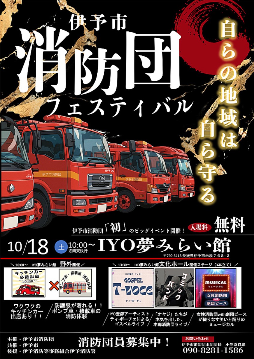 2025年10月18日(土)、愛媛県伊予市のIYO夢みらい館にて「伊予市消防団フェスティバル」が開かれます。