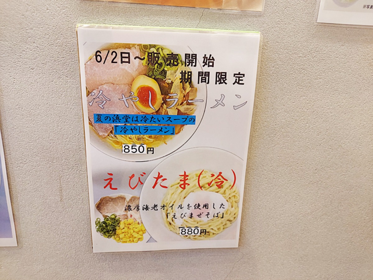 期間限定メニューの「冷やしラーメン」や「えびたま(冷)」。