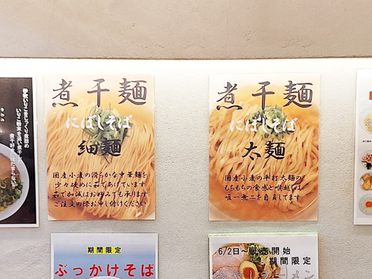 「煮干麺(にぼしそば)」は、細麺と太麺が選べるスタイル。