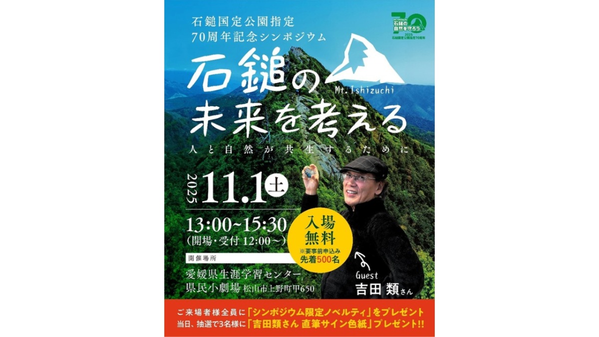 西日本最高峰・石鎚山を中心に広がる「石鎚国定公園」が、今年で指定70周年を迎えます。これを記念して、自然の魅力や未来の保全について考えるシンポジウムが開催されます。参加無料・事前申込制なので、石鎚の自然を愛する方はもちろん、山やアウトドアに興味がある方も、ぜひ参加してみませんか。