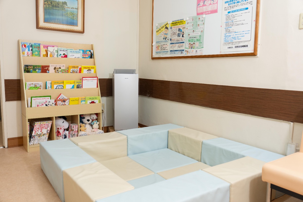 待合室にはキッズスペースを設け、絵本やぬいぐるみを揃えています。耳や鼻の洗浄などのため、生後半年頃から通う人も。