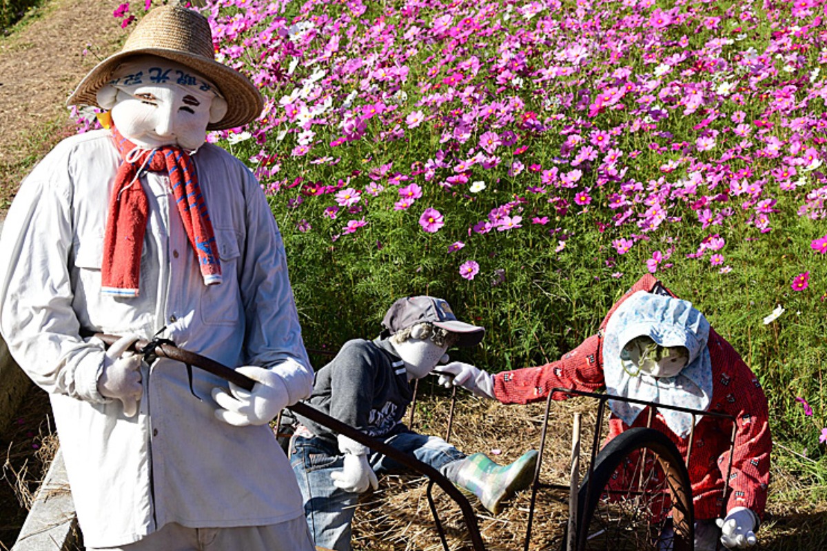 みま町コスモスまつりでは、徳島県東祖谷「天空の村 かかしの里」からやってきた個性豊かなかかしたちも大人気。
