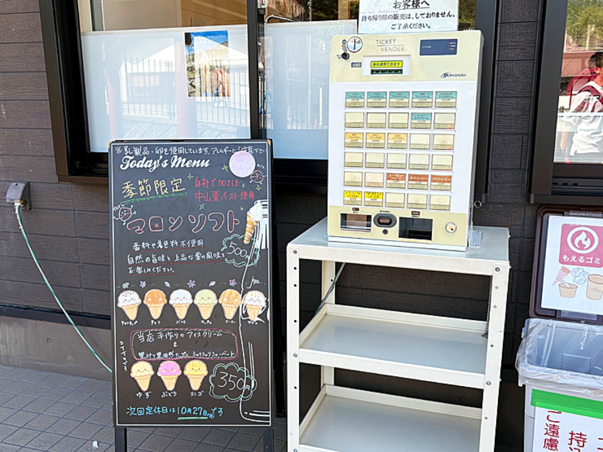 ソフトクリームもマロンのみならず多彩なラインナップ。お会計は現金のみなのでその点はご注意を。
