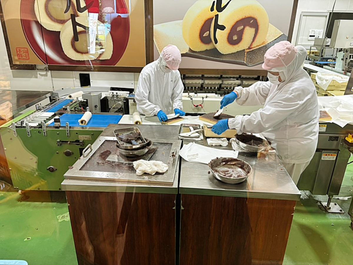 焼き立ての生地に餡をのばし、1本1本タルトをくるくると手巻きしていく作業など、普段見られない裏側が間近に!丁寧に、素早く巻く職人技に思わず見入ってしまいます。リニューアルされて、見学スペースが3倍になったことで見やすくなり、家族も団体さんも楽しく見学できますよ!