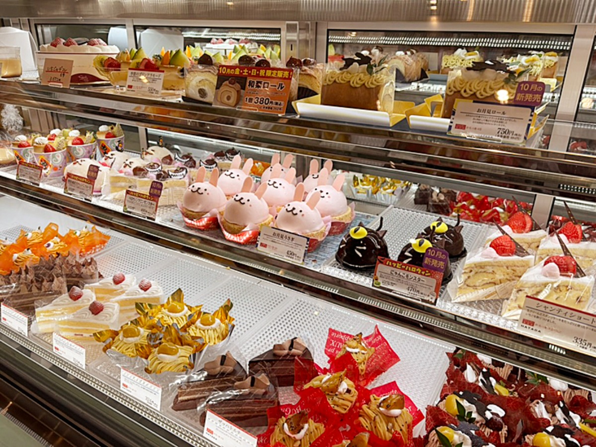 店舗奥には季節の洋菓子も勢揃いです。和栗ロールやお月見うさぎ、ハロウィンのにゃんこモンスターといった可愛いケーキも並んでいます。