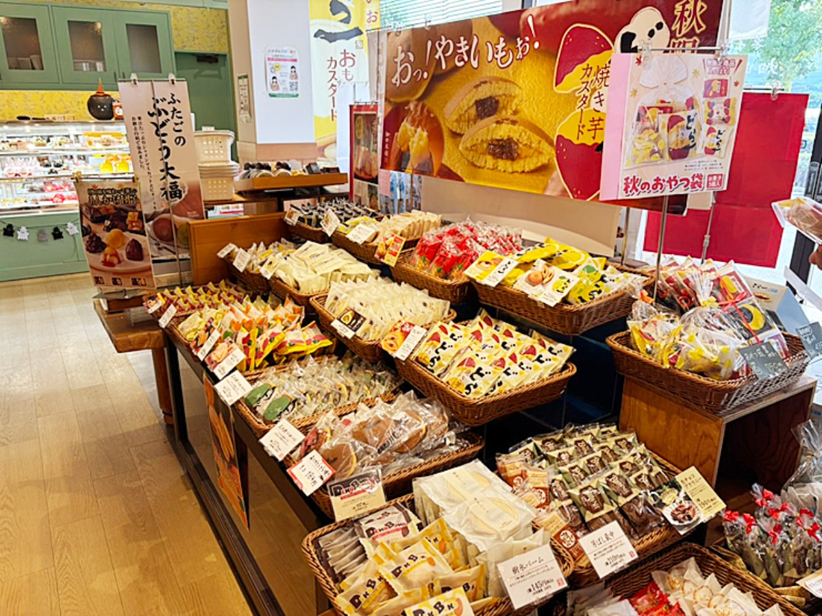 お菓子館にはたくさんのお菓子が並び、その広さと品揃えに思わずびっくりしました。栗タルトのギフトコーナーのほか、おやつやお土産用のお買い物コーナーも充実しています。