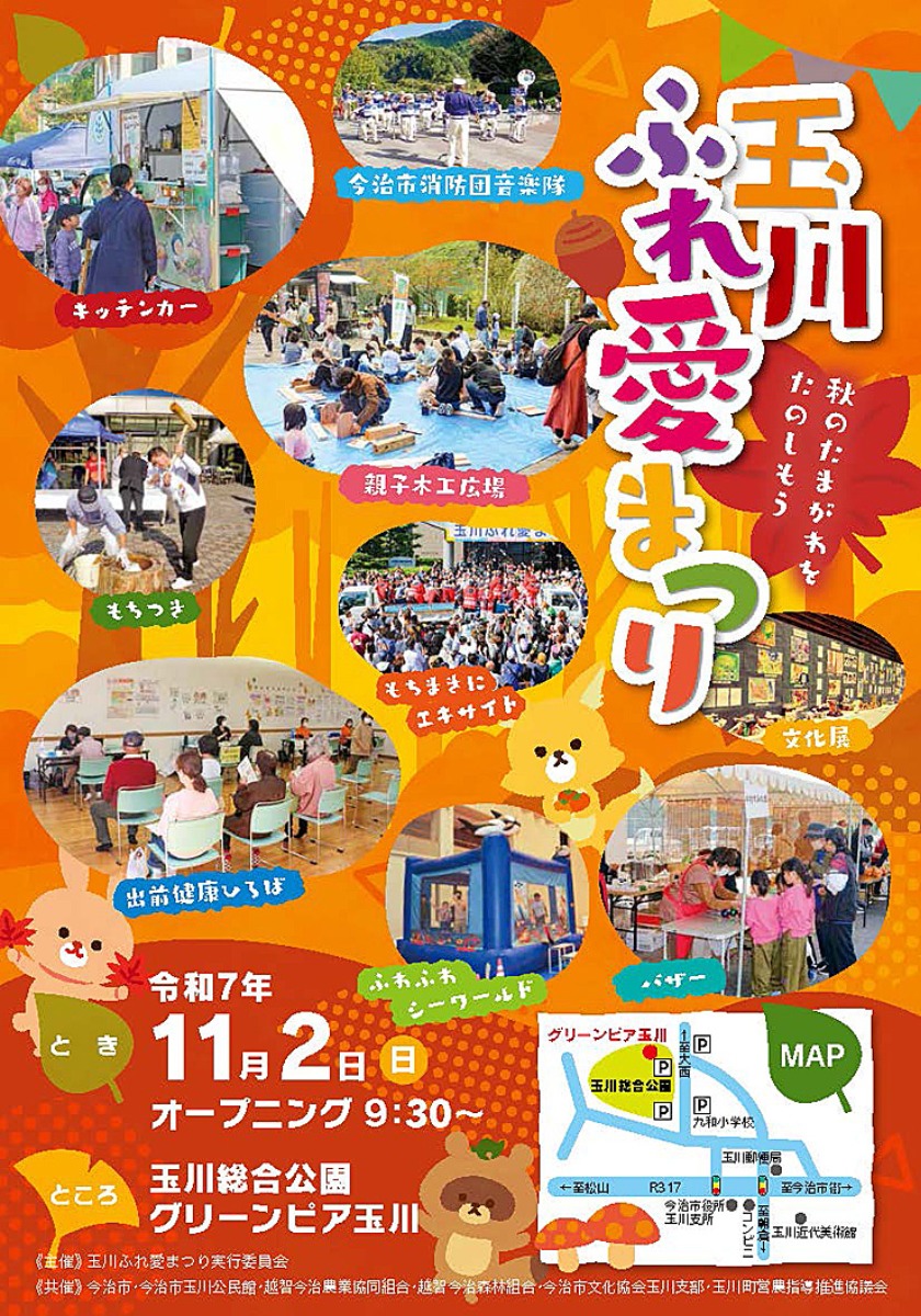 秋色に染まる玉川町では、地元農家自慢の新鮮野菜や果物が並ぶ「ふれ愛市(農産物等即売)」が毎年大好評です。