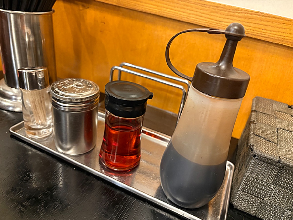 ラーメン好きは気になるであろう卓上調味料はこちら。ラーメンコショウ、餃子用のタレ&ラー油とかなりシンプル。
