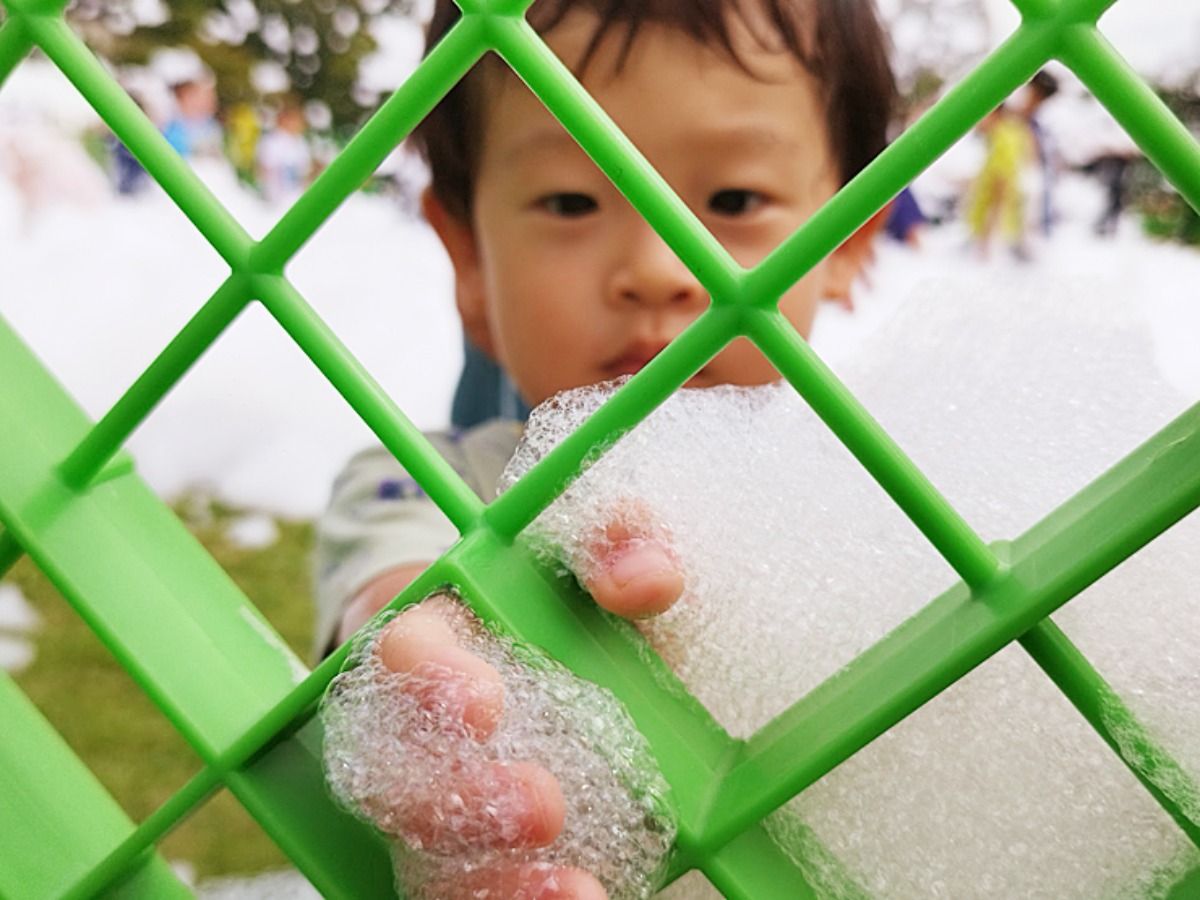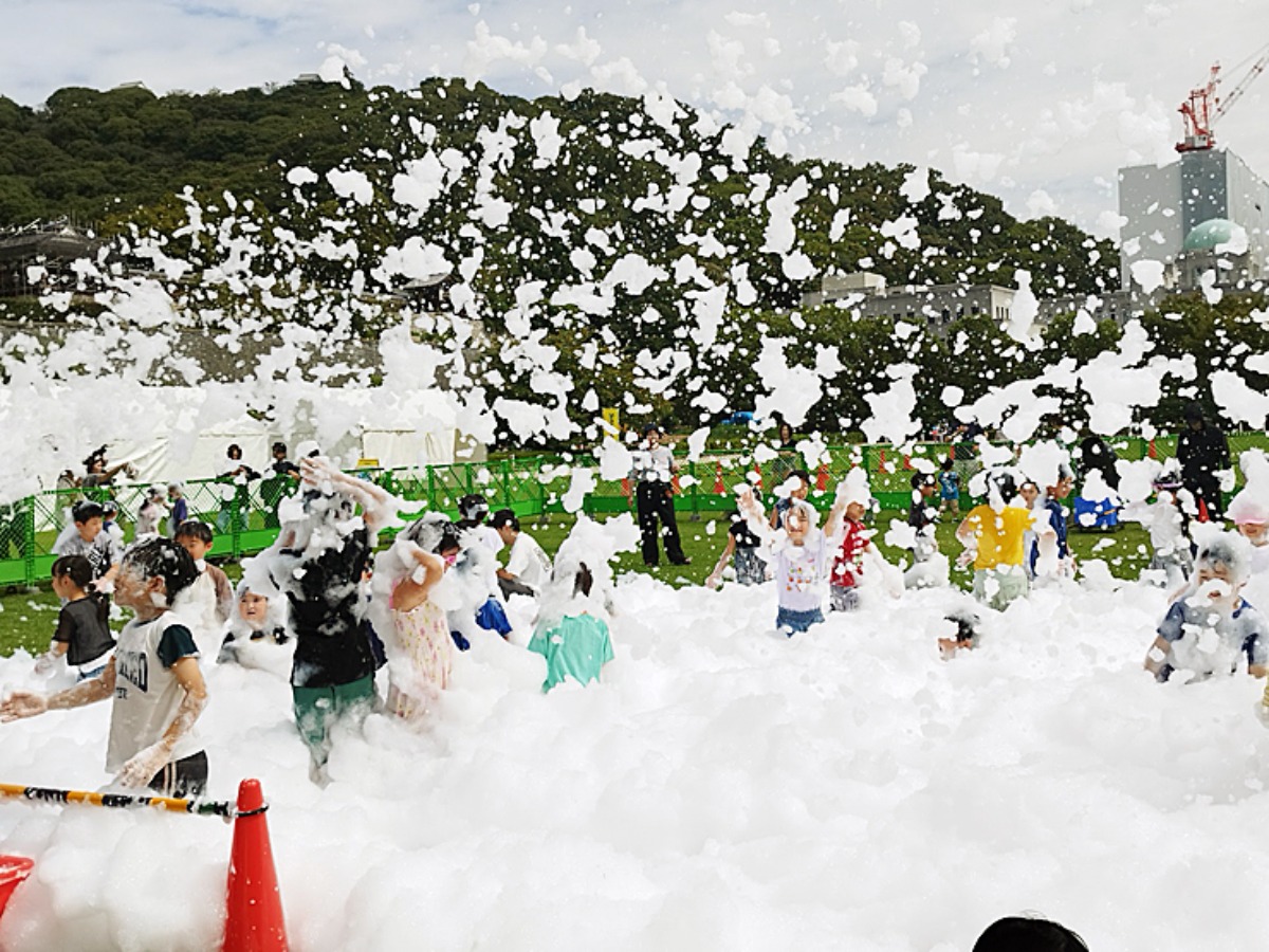 雲が降ってきたような大量の泡の中で輝く子どもたちの笑顔がとっても印象的でした!