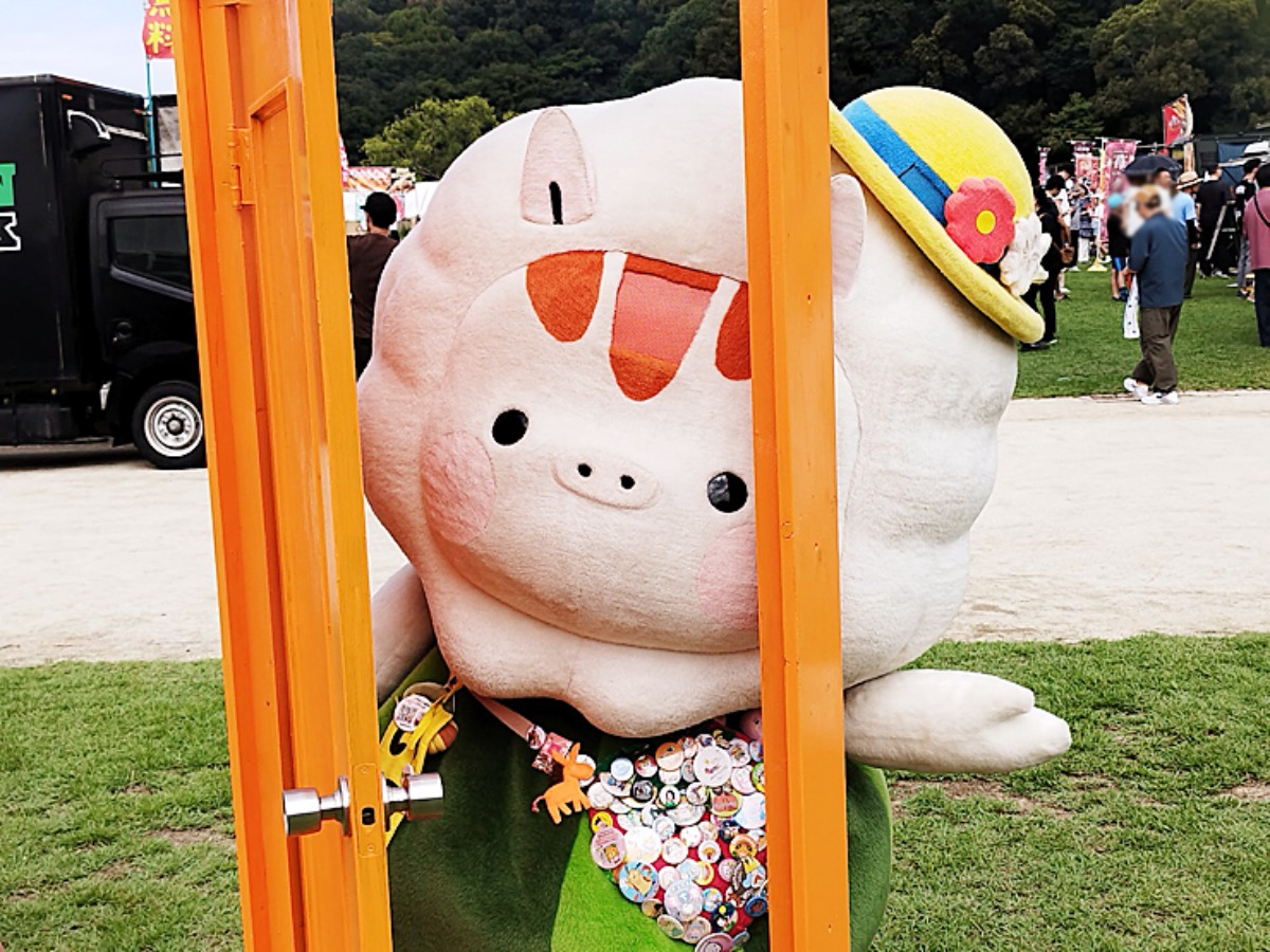 ドアの向こうから東温市のゆるキャラ「いのとん」がこんにちは。