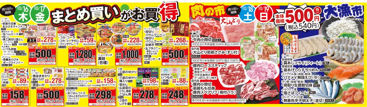10/16(木)・17(金)まとめ買いがお買得!|10/18(土)・19(日)肉の市・大漁市!
