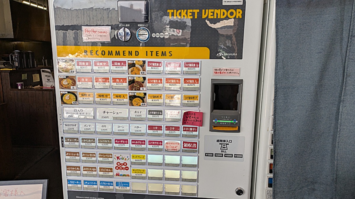 まずメニューの注文方法は、店内に入るとすぐに券売機があるので、そこでチケットを購入してください。