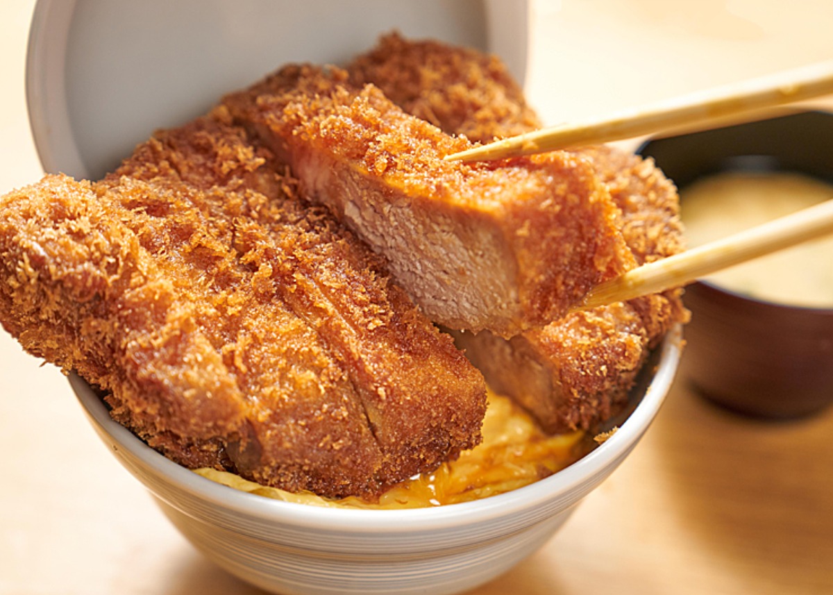 半熟玉子の上に、甘辛いタレ をまとったカツをのせた贅沢な 一杯。イートイン利用では鯛ダ シ味噌汁が付く