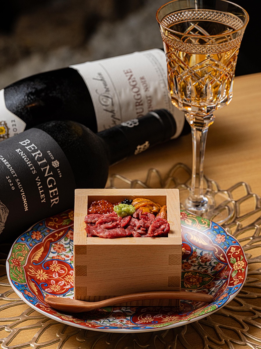なかでも、程よくサシが入った和牛に、キャビア、ウニ、イクラを合わせた「升寿司」は、和牛の甘みとワサビのアクセントが絶妙に調和し、特別感を演出。